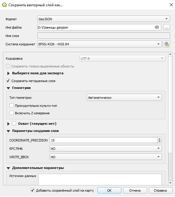 6. Сохранить полученный временный слой с полигоном в формат GEOJSON. Для этого кликнуть правой кнопкой по слою в диспетчере слоев -> «Экспорт» -> «Сохранить объекты как». В открывшемся окне назначить систему координат «EPSG: 4326 - WGS-84». Назначить папку сохранения и нажать «Ок».