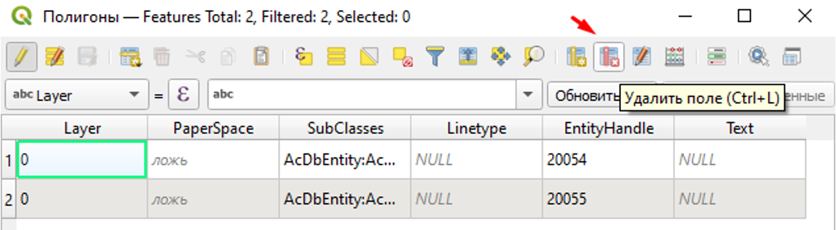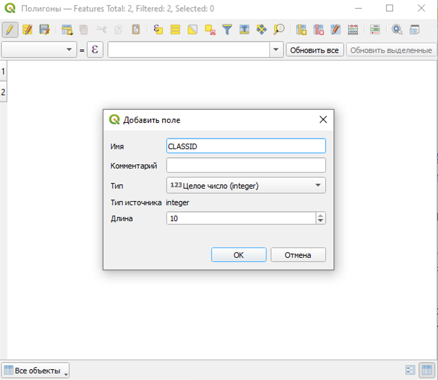 2. Открыть таблицу атрибутов временного слоя (полигона ЗОУИТ), полученного после перевода линий в полигон. Запустить режим редактирования (иконка