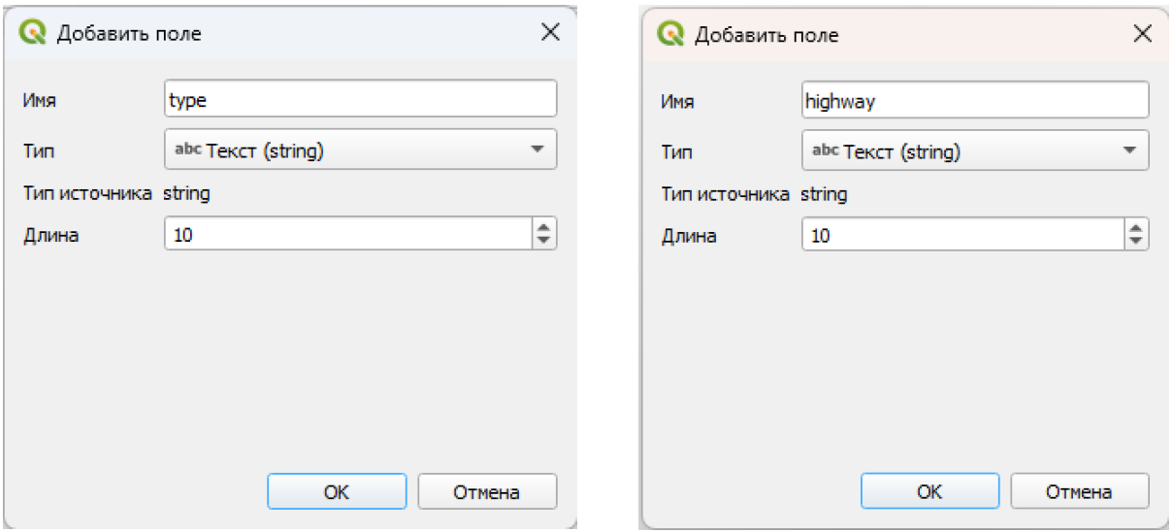 ) создать 2 новых поля с именем «type» и «highway». Тип «Текст (string)», Длина «10».