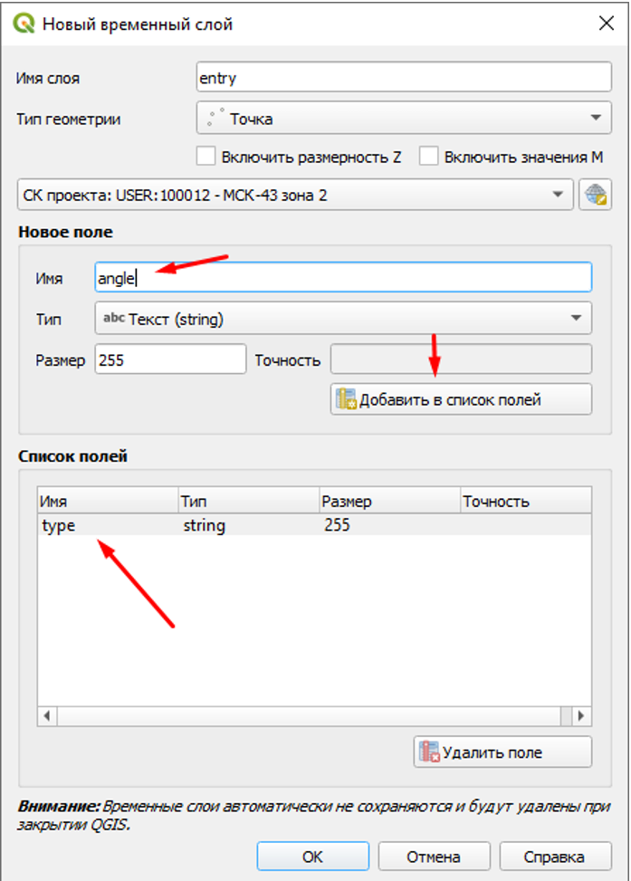 2. В новом открывшемся окне ввести наименование слоя, выбрать тип геометрии «Точки» и назначить МСК проекта. В данном окне также необходимо создать 2 новых поля текстового типа (string): «type» и «angle», которые будут отвечать за тип точек и угол направления вектора улицы с окружения внутрь территории проекта.