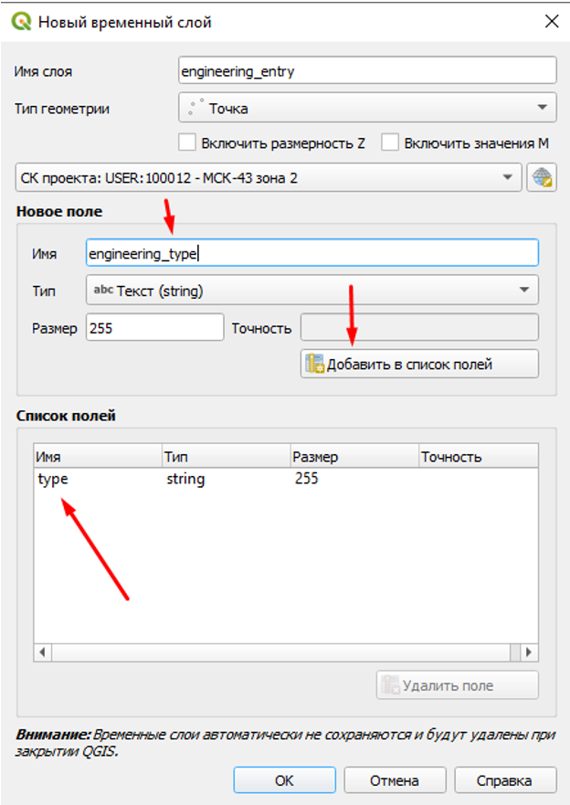 2. В новом открывшемся окне ввести наименование слоя, выбрать тип геометрии «Точки» и назначить МСК проекта. В данном окне также необходимо создать 2 новых поля текстового типа (string): «type» и «engineering_type», которые будут отвечать за тип точек и тип инженерной сети.