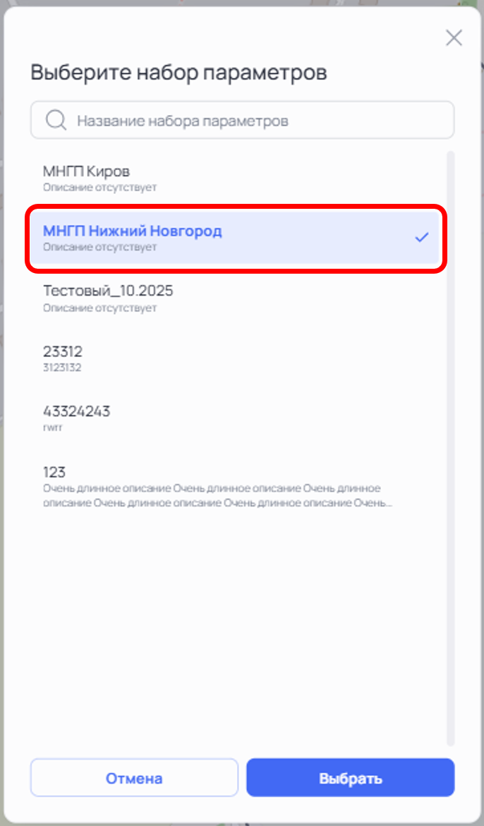 Если для проекта уже создан и сохранён необходимый Набор параметров, то его можно просто выбрать из списка доступных наборов в появляющемся окне, щёлкнув ЛКМ по нему и затем «Выбрать». На основе существующих Наборов параметров можно создать новый набор параметров.