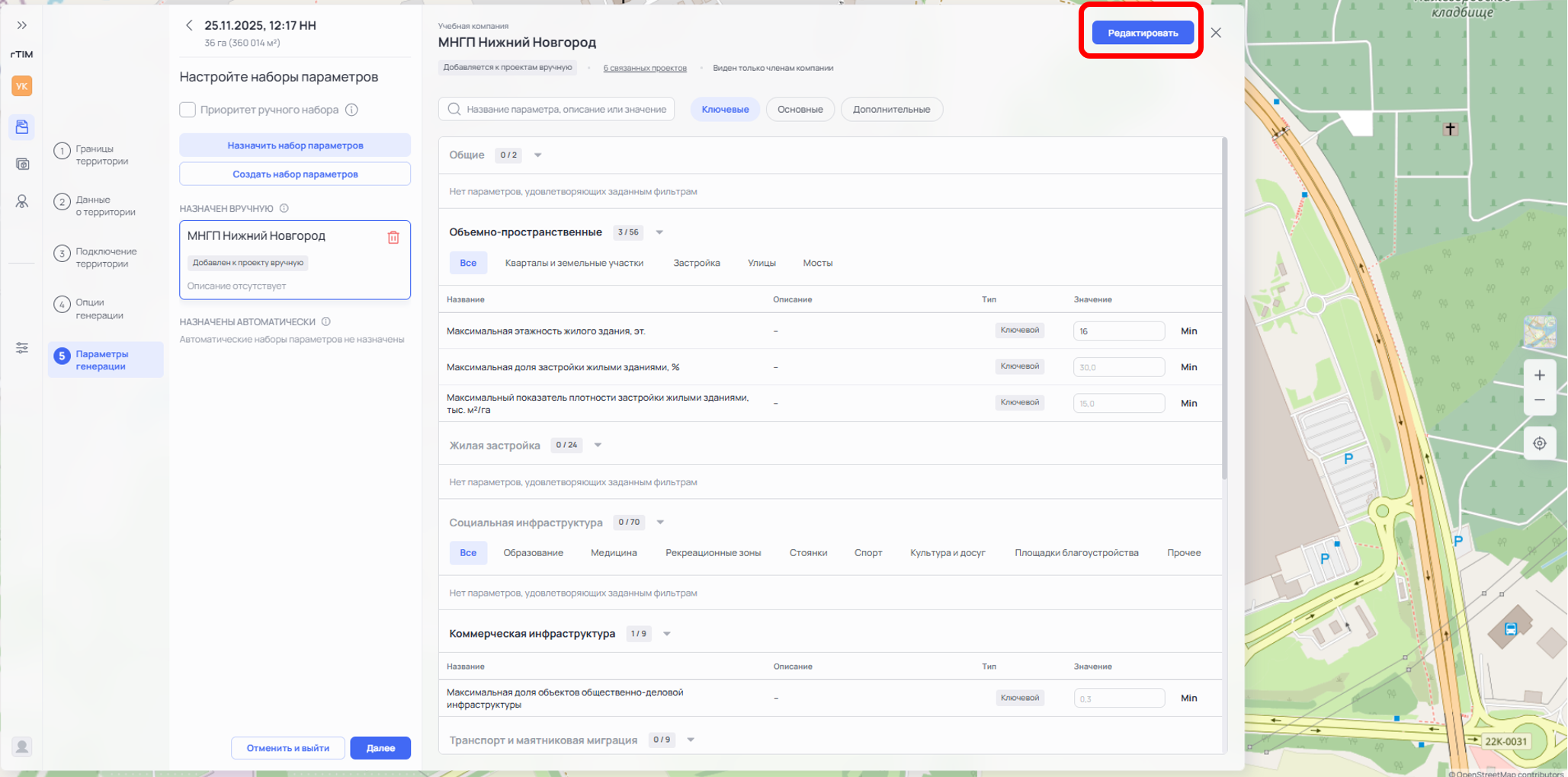 Следующим шагом при создании проекта является назначение набора параметров генерации. На этом шаге задаётся более точная настройка общих, объёмно-пространственных параметров, жилой застройки, социальной и коммерческой инфраструктуры, транспортной инфраструктуры и маятниковой миграции, инженерной инфраструктуры, экономики, санитарно-защитных зон и квартирографии, к которым будет стремиться алгоритм генерации при создании Концепций.