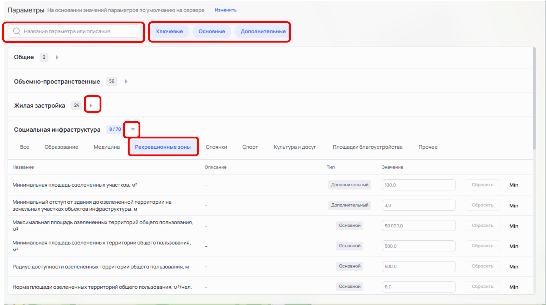 Для навигации, фильтрации и сортировки в списке параметров можно активировать/деактивировать соответствующие типы параметров нажатием ЛКМ, скрывать/разворачивать соответствующие категории или вводить название необходимого параметра в строку поиска. Для удобства каждая категория дополнительно разделена на подкатегории: