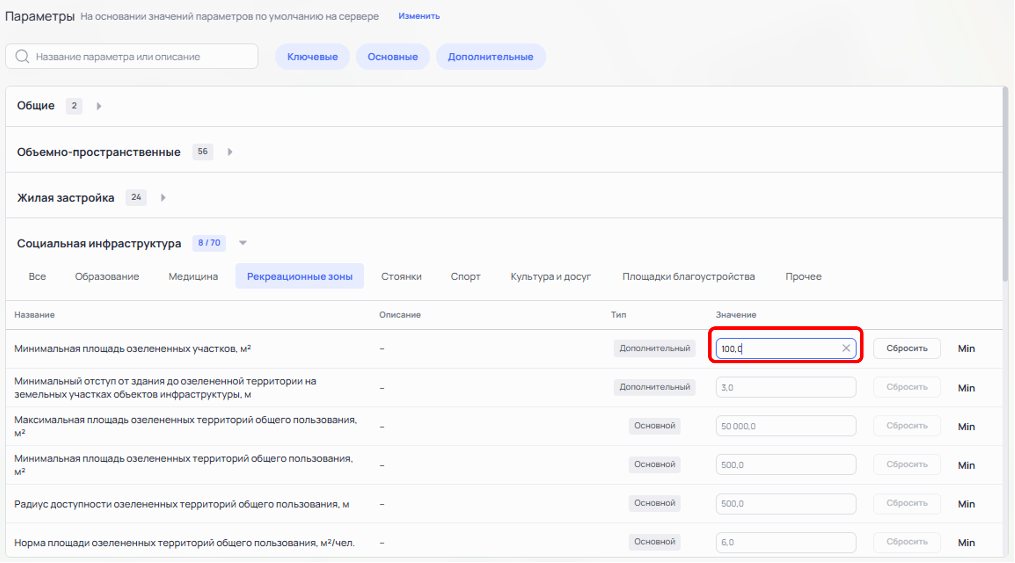 Клавишами-стрелками вверх и вниз можно увеличивать или уменьшать уже введённое значение (с шагом 1 для целочисленных параметров и 0,01 для остальных). Введенное значение параметра можно вернуть к значению по умолчанию, нажав ЛКМ крестик в поле ввода или нажав кнопку «Сбросить».