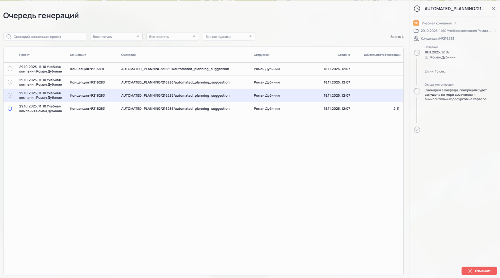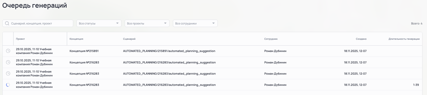 В таблице «Очередь генераций» отображается информация о Проекте, Концепции, названии Сценария, запустившем её Сотруднике, дате и времени запуска Генерации и её длительности.