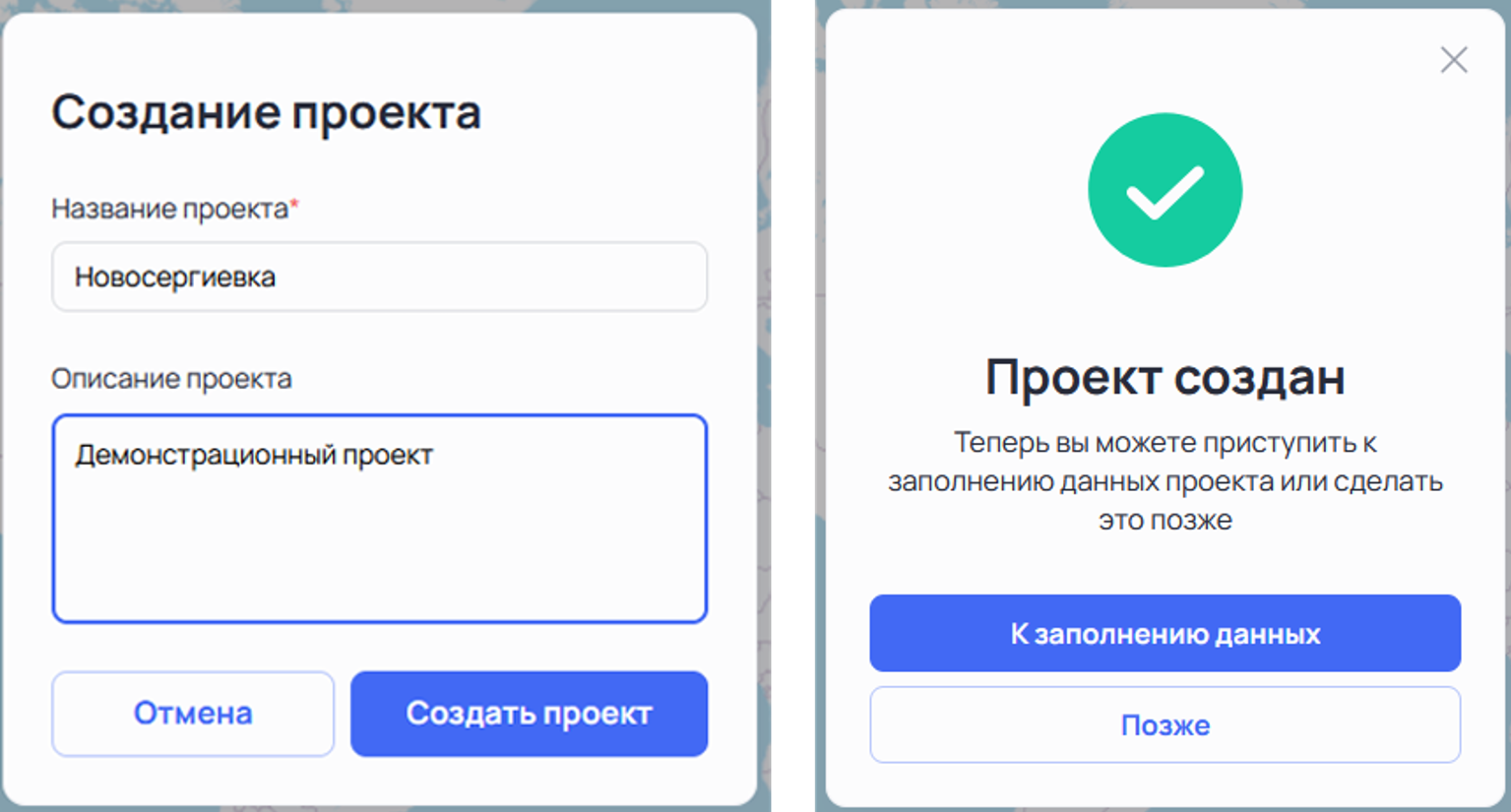 В открывшемся окне ввести название проекта и описание (при необходимости) и нажать «Создать проект», после чего выйдет новое окно с уведомлением об успешном создании проекта, где необходимо нажать кнопку «К заполнению данных» или «Позже», если на данный момент в этом нет необходимости.